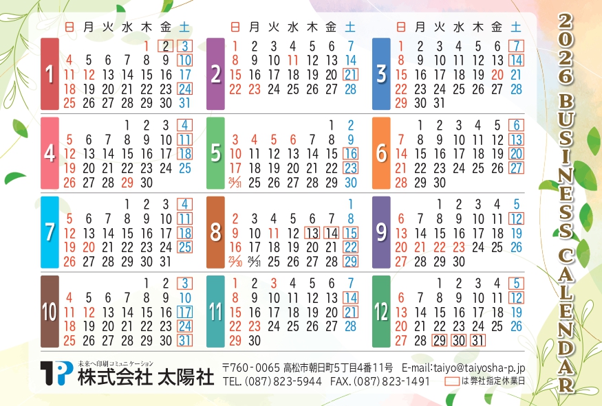 2026年営業日カレンダー 投稿日: 2026年1月5日2026年1月22日 mw2pl0bk7k 2026年営業日カレンダー 投稿日: 2026年01月05日 謹賀新年 昨年中は格別のご愛顧を賜り、厚くお礼申し上げます。 本年も皆様のご要望にお応えし、いっそう精励いたす決意です。 本年もよろしくお願い申し上げます。 ►NEW一覧に戻る